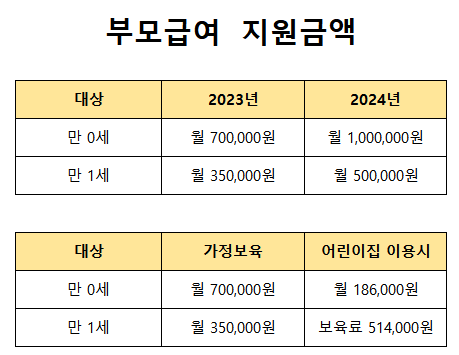 부모급여는 다가오는 2024년에는 지원금이 확대되어 만 0세 아기는 월 100만원, 만 1세 아기는 월 50만원을 받을 수 있습니다. 자세한 내용은 아래 표를 참고하시기 바랍니다.