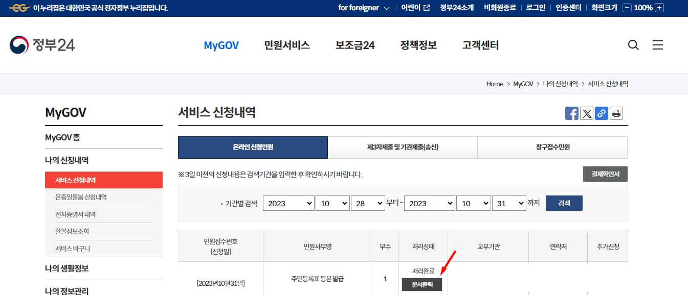 ▶ 서비스 신청내역에 가셔서 문서출력을 누르시면 PDF 파일로 인쇄가 가능합니다.